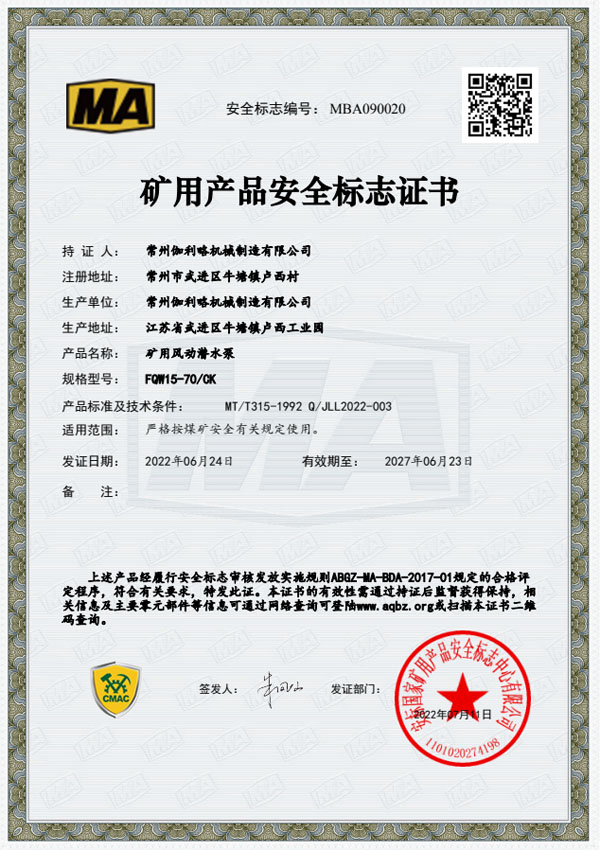 • 礦用安全標志證書-FQW15-15/K